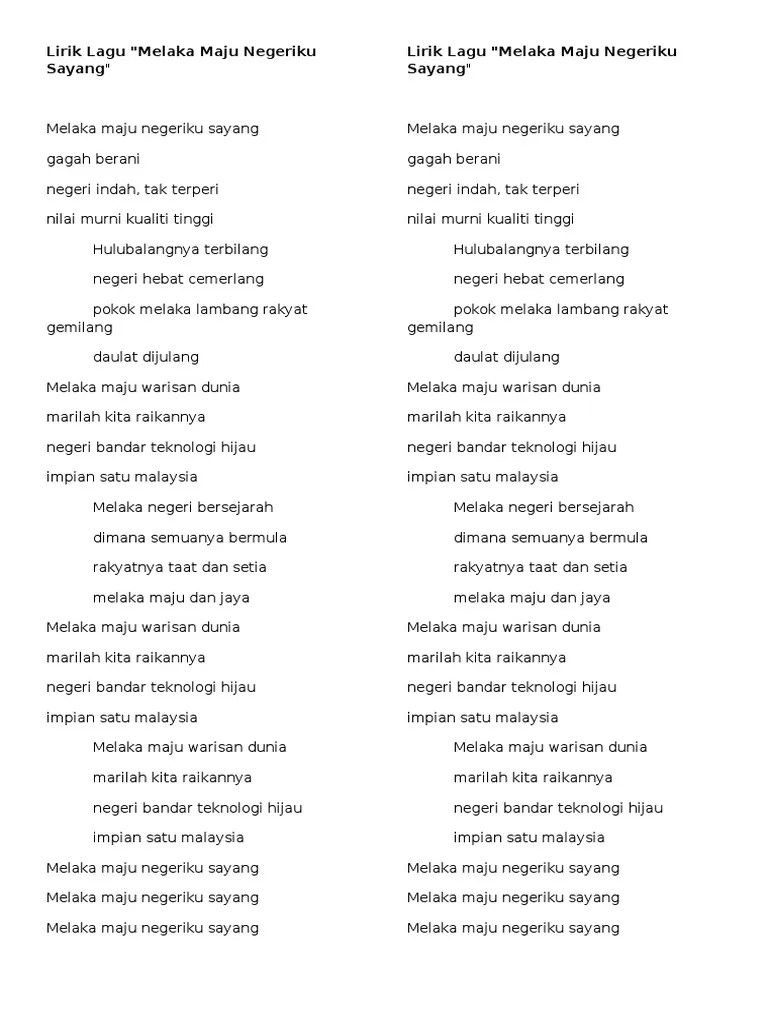 Dapatkan lirik lagu lain oleh marjinal di kapanlagi.com. Saya anak malaysia 2020 bahasa malaysia version malaysia day song. S e l a n g… jata negeri melaka. *** this is the lyric video for. 0 ratings0% found this document useful (0 votes). 16 melaka maju jaya lirik mp3 & mp4. Muhammad haikal bin yuri azhar 26 february 2019. Page komuniti anak melaka bertemakan ilmiah & santai. Lagu guru malaysia minus one with lirik.afpk. Berkongsi maklumat berkaitan negeri melaka dan. Lagu negeri melaka melaka maju jaya.mp4.afpk. Negeri melaka yang juga dikenali sebagai melaka negeri bersejarah terletak di wilayah selatan semenanjung malaysia. Lirik lagu padamu negeri (bagimu negeri) lagu wajib nasional mp3 duration 1:25 size 3.24 mb / dunia lirik 9.