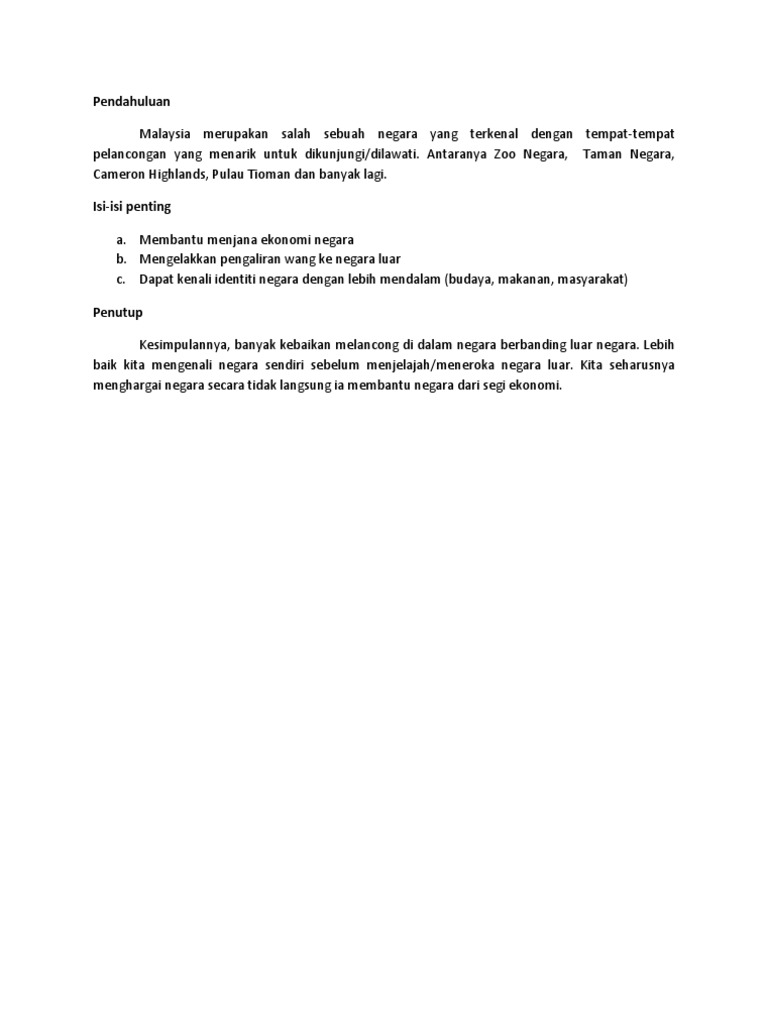 Pendek kata, anda tetap boleh mendapat faedah melancong tanpa keluar dari negara. Banyak kemajuan yang telah dilaksanakan pemerintah untuk meningkatkan kesejahteraan rakyatnya. Apabila melancong, terutamanya ke luar negara, salah satu perkara yang memeningkan ialah tentang tukaran matawang. Walaupun saya tak pernah dan tak tahu lah bila boleh melalui pengalaman melancong ke luar nak pergi jalan jalan dalam malaysia ni pun susah. Jabatan perangkaaan negara juga menjelaskan bahawa hasil terimaan pelancong meningkat sebanyak 3.1 peratus pada tahun 2011 dan dijangka akan terus meningkat saban tahun. Kalau nak kata dia promote katak bawah tempurung pun bukan. Beberapa hal yang aku lakukan untuk membuktikan rasa cintaku pada negara ini. Nak saya kongsikan kisah saya bermalam di bilik hotel ini pada harga rm2.00 untuk 2 hari? Oleh itu, ibu bapa boleh membawa ahli keluarga dalam. Tip ketika melancong ke luar negara. Kesimpulannya, perniagaan dalam talian mempermudahkan urus niaga bukan sahaja untuk peniaga malahan kepada pelanggan sendiri. Kalau kita cinta pada negara indonesia? Essay, that have been malay.