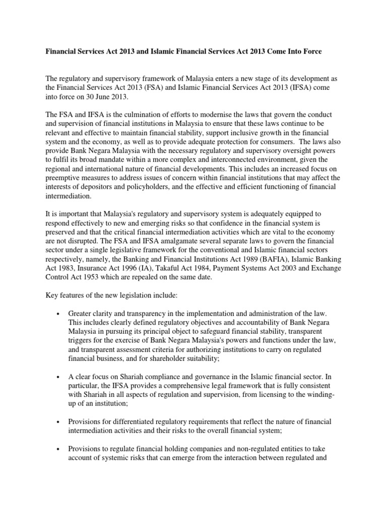 The lessons learnt by malaysian regulators from all these financial crises are reflected in the enactment of the financial services act 2013 (fsa) and islamic financial services act 2013 (ifsa). (d) in sales contract, islamic jurists allow the difference between cash and credit prices of a commodity. The islamic financial services act 2013 (malay: The islamic financial services act, 2013 ( ifsa) contains xviii parts with 291 sections and 16 schedules. The islamic financial services act 2013 3 3.